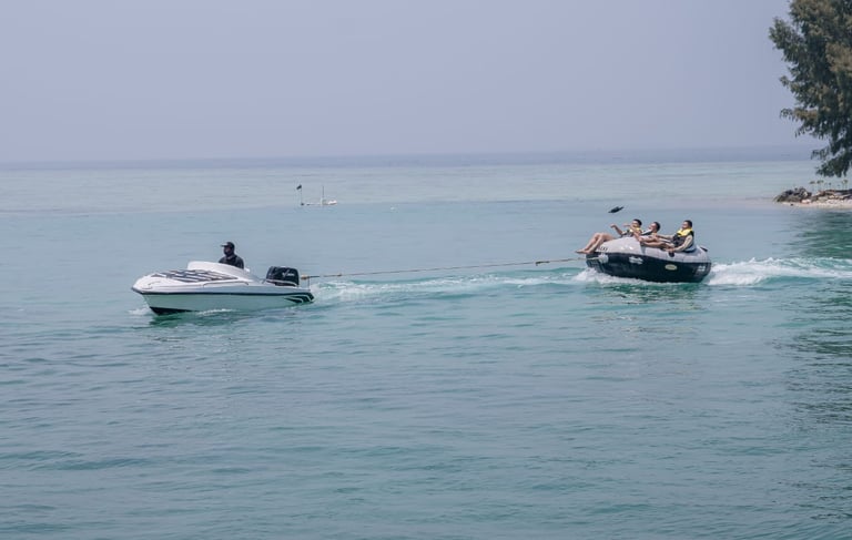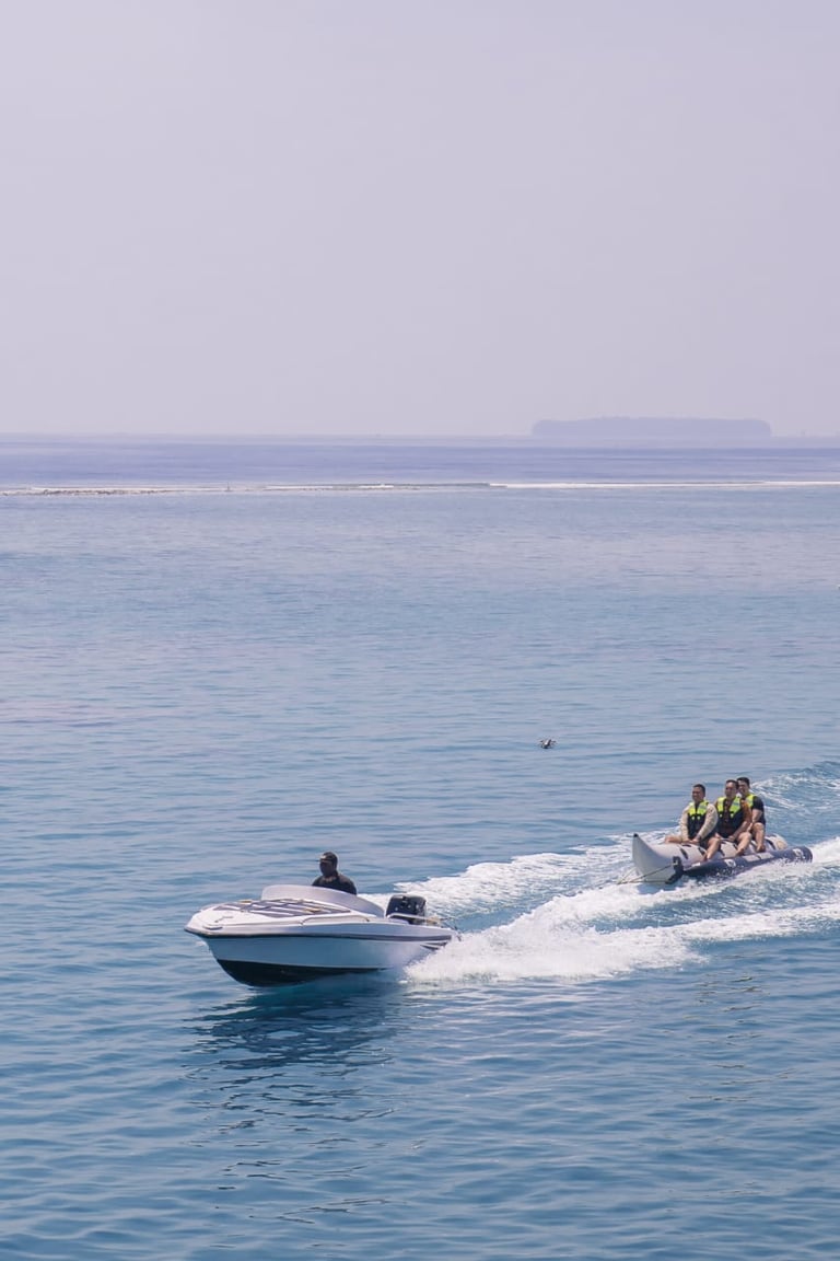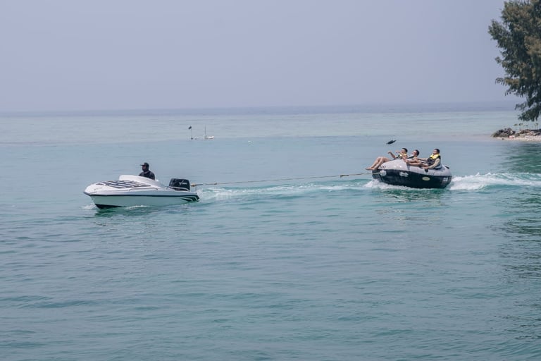 Banana boat, Permainan ini populer di tempat wisata pantai dan menampung beberapa orang yang duduk di tabung utama sambil menstabilkan perahu dengan kaki di tabung samping dengan di tarik dengan speed boat. bersama kami anda akan merasakan sensasi keseruan bermain wahana banan boat secara gratis 1 kali naik.