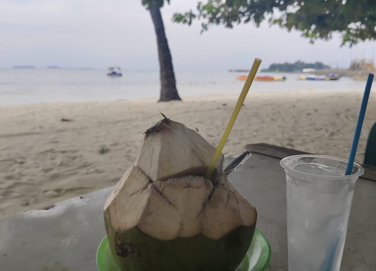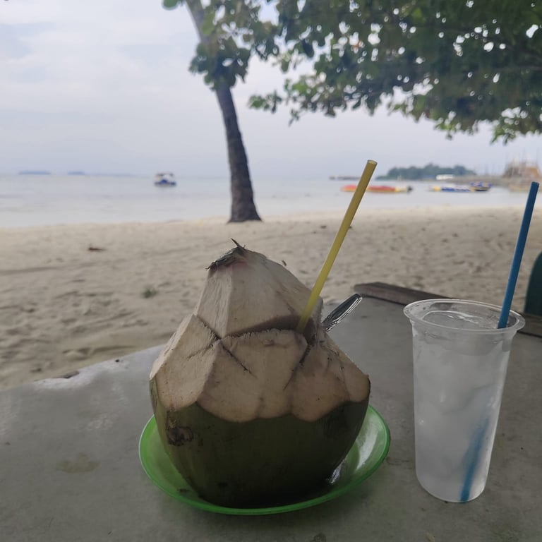 Es kelapa muda adalah minuman segar penyejuk dahaga dan pikiran yang sedang panas yang terbuat dari daging dan air kelapa yang masih muda. pilihan minuman yang cocok untuk menemani liburan anda di pantai P. Tidung.