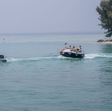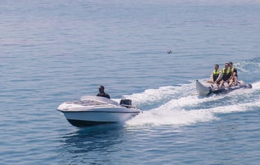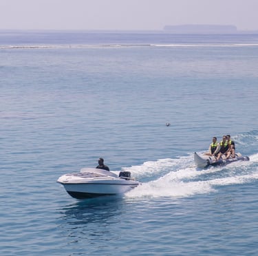 Banana boat, Permainan ini populer di tempat wisata pantai dan menampung beberapa orang yang duduk di tabung utama sambil menstabilkan perahu dengan kaki di tabung samping dengan di tarik dengan speed boat. bersama kami anda akan merasakan sensasi keseruan bermain wahana banan boat secara gratis 1 kali naik.